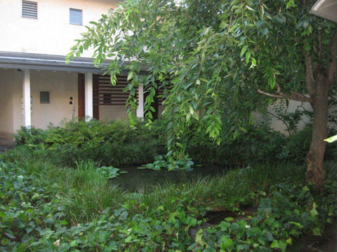 今回、会場となったギャラリー鶉は閑静な住宅街の中にある都会の中の小さなオアシスのような場所。テラスハウスを中心とした集合住宅の敷地内にあり、建物のすぐ隣にはメダカも泳ぐ小さなせせらぎと池、柳などの木々が自然の風を運んでくれる庭があります。