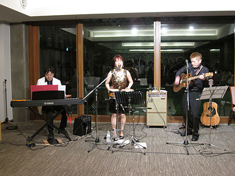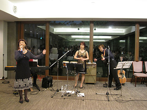 司会は成澤布美子さん、ゲストとしてゴスペル・ユニットのAya & Kenをお迎えして、100名を超える参加者のもと盛大に行われました。大型台風の接近にも関わらず大勢の方が出席して下さったことに感謝した高山プレジデントのウィットに富んだ挨拶のあと、IIDA企業メンバーの株式会社イオニアの代表取締役 齋藤登氏による献杯のご挨拶がありました。そして歓談、お食事となり、その間、チャリティーセールのコーナーでは、会員自らが準備したデコTシャツや多くの参加者が出品して下さったインテリア商材などが販売されました。