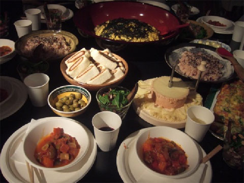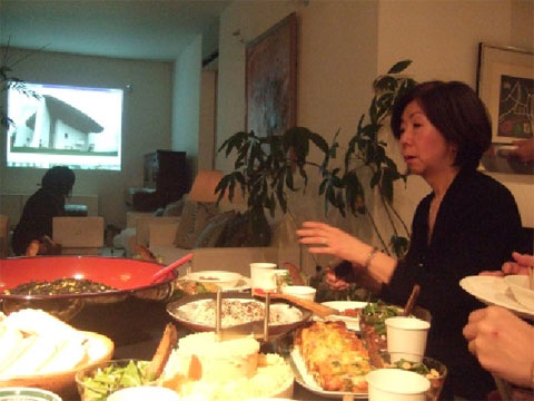 今回は11人分ですから 時間内で見るのは不可能ですが 壁に大写しにして お互いの作品を見て 旅の想い出話をするのも 楽しいものです。持ち寄りの美味しい食べ物を ワイン・・・・この旅行の締めくくりに楽しい夕べになりました。