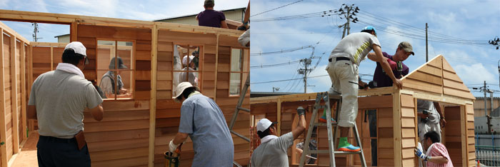 全員の動きに無駄がなく、オイルステインを塗ったり、テキパキ作業をこなしていきます。壁、屋根、扉どんどん完成に向けて出来上がっていきます。建て物が完成に近づく頃女性メンバーの出番です。花の植え込み、感銘板の準備も始まりました。