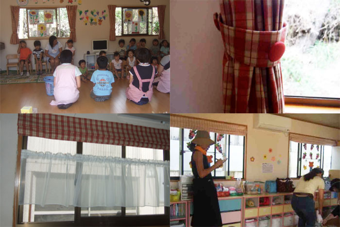 ボートハウスで手一杯だと思っておりましたがイオニアさんから可愛いチェックの カーテンをご寄付頂き、仙台のホームテックさんが特別価格で縫製して下さいました。ローマンシェードやカフェカーテンまで付いています。保育園の中は掃き出し窓にはカーテンが付いていましたが腰窓はシールや絵で応急処置が施されていました。
