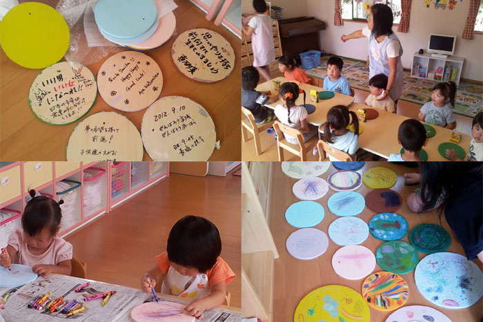 プレートの後ろには頑張って!の気持ちのメッセージ、表には園児の好きな物が 書かれています。このプレートに塗られたペンキはブライトンさんからご寄付頂いたものです。年齢それぞれの絵が出来上がりました。大人も混ざって書きましたが子供の才能にはかないません。