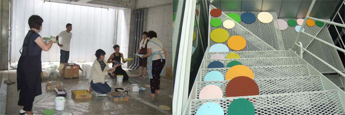 この時もブライトンさんの山本さんがが刷毛やローラーなど持ってきて下さり、塗装の仕方のご指導をして下さいました。随分上達し、ペンキ塗りが楽しくなりました。 山本さんは石巻にも来て下さり子供をあやしたり、力仕事をお手伝い下さり大活躍でした。 子供達のお昼寝前のお仕事は扉にトウジャReをモザイクのように貼ることでした。