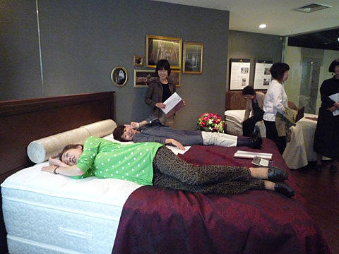次に構造の説明があり、いよいよ皆で実際に様々なベッドに寝てみて「あーでもない。こーでもない。」とにぎやかに実地体験。好みも人それぞれということがよくわかりました。