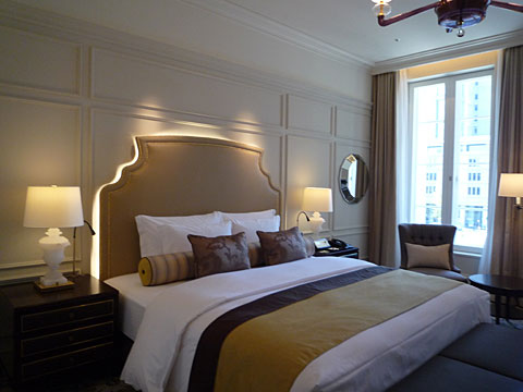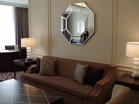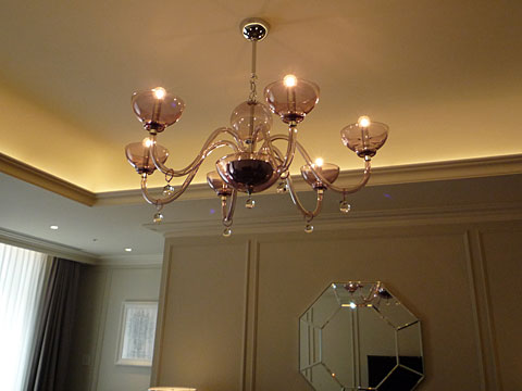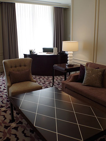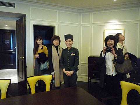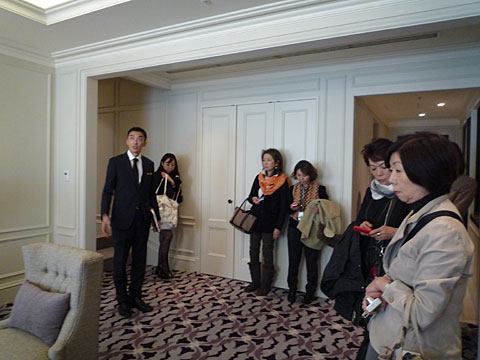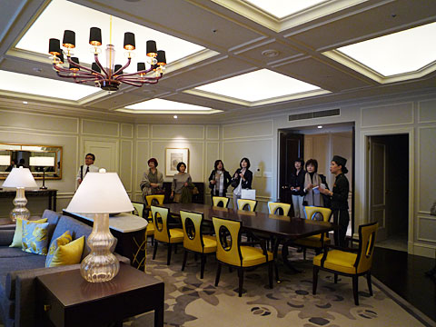 満室のためスタンダードなお部屋は見学できませんでしたが、普段泊まることのないゴージャスな客室を見ることができ皆さん溜息まじりに「素敵!」を連発していました。ここ何年かつずいた外資系のスタイリッシュなホテルに比べ、シャンデリアやソファやクッションに様々な色や柄が使われ、どこかほっとする温かさを感じます。