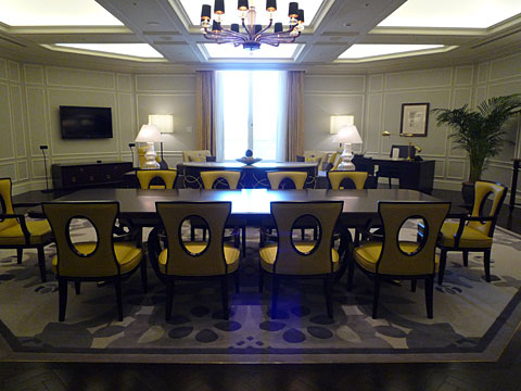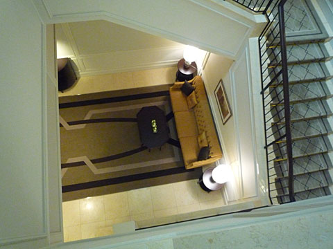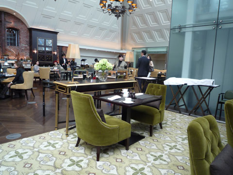 見学の後は3階のアトリウムでホテルの成り立ちや今回の復元のお話を聞きました。元は屋根裏部屋だった空間を利用し天井の一部をガラス張りにして自然光を入れています。見上げるような傾斜天井にこれまた巨大な黒いシェードのシャンデリアが3台。部屋の中央には建築当初のレンガ壁がそのまま生かされ、この空間のフォーカルポイントになっています。とても気持ちのいい空間で、宿泊者の朝食の場所として利用されています。
