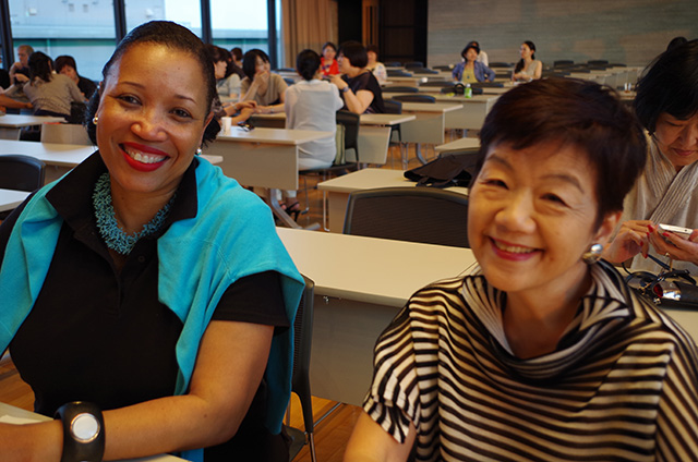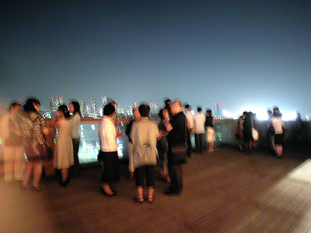 見学ルートの最終地点が7階セミナーホールで、ホールを囲むテラスで薄暮の美しい景色を背景に歓談を楽しみました。また、ムーサス氏のセミナー開始の前には、同セミナーホール会場にてIIDA日本支部の総会が行われ、前年度と今年度のボードメンバーの紹介がありました。また、IIDAシカゴ本部からお越しのシェリル・ダースト氏にもお言葉を頂きました。