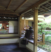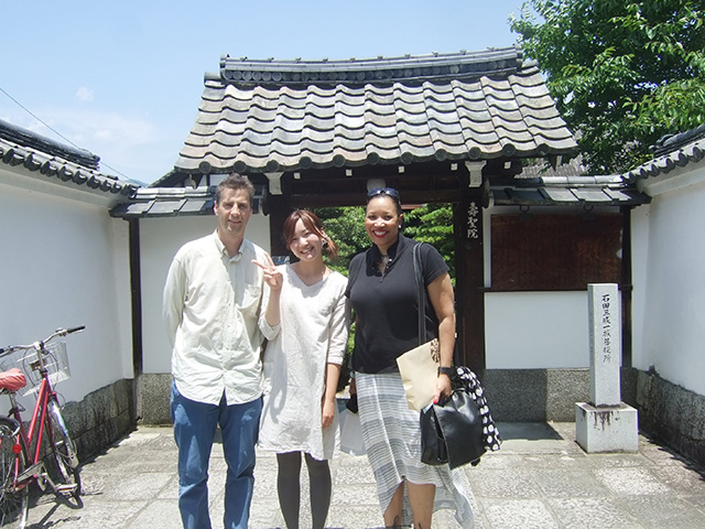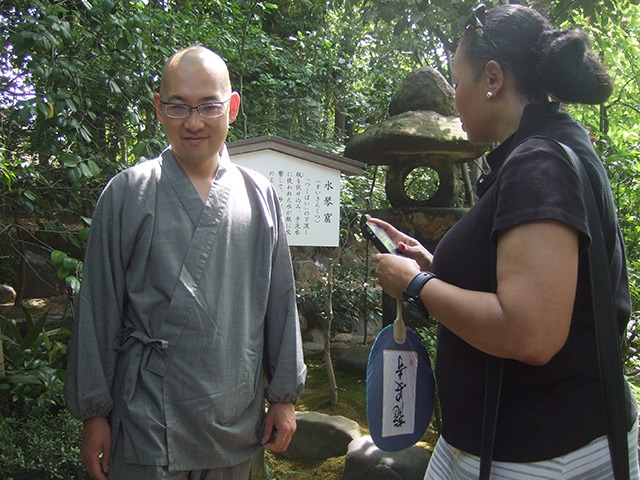 7月11日(木)10:00AM 妙心寺の山門で待ち合わせ 退蔵院見学へ。 そこには日本襖振興会代表理事の池田様と京都の株式会社 加徳の加藤幸雄様が待っていらっしゃり 京都テレビのカメラが回っていました! 妙心寺、退蔵院の副住職、「京都観光おもてなし大使」であられる 松山大耕様のご案内で 退蔵院を見せて頂きました。 松山副住職は さすが流暢な英語で説明して下さり 色々と詳しく伺う事ができました。