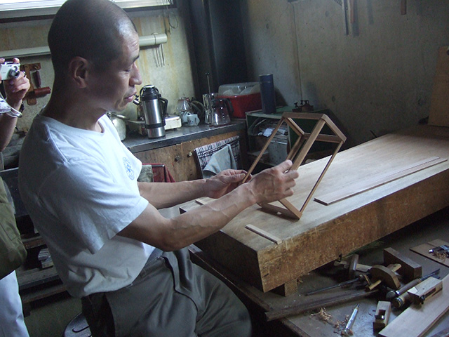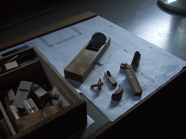 高桐院でGeoffreyさんと合流して 中村外二工務店に行きました。 中村外二工務店はGeoffreyさんが前に働いていた工務店で俵屋の改装などを手掛けている名門です。和室に合う照明器具を作っているとの事、その製作現場にお邪魔し 正に日本の技術、工藝、職人の技を見せて頂きました。細かい作業は 細かい道具が必要です。その一つ一つの作業の為に自分で道具を作っているそうで 大切な道具箱を見せて頂きました。これには 私達も感動しました。