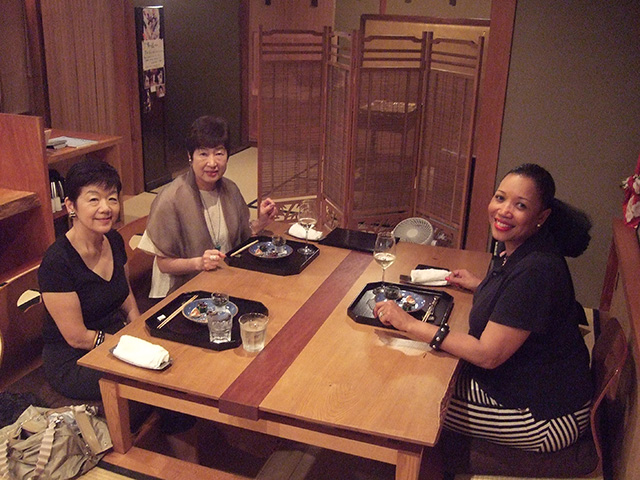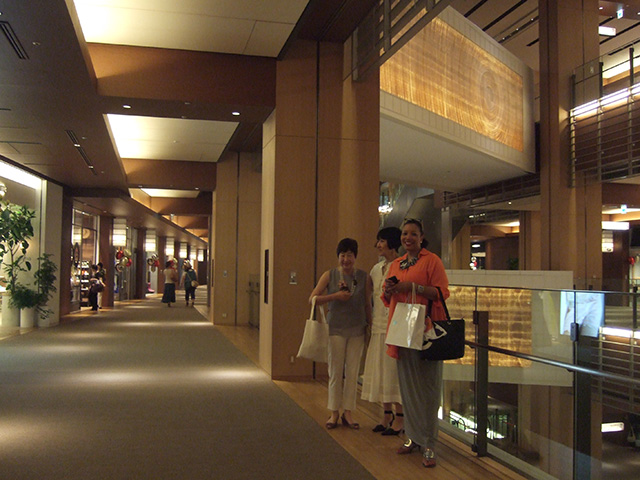 7月8日(月)は Herman Miller, Tokyo とのアポがあり、丹羽さんがホテルにお迎えに行き お連れして下さいました。 すばらしいオフィスを見せて頂き 今後はJapan Chapter との親交も深めるような方向で行けそうです。 その後ホテルから観光バスに乗って 東京の名所めぐりを・・・屋根のない2階バスから 36度?の炎天下東京を見て頂きました! そして銀座の三越で デパート体験をして頂き 新館の日本の小物を売っている所で 絞りの素敵なマフラーを買われました。 欲しい物は沢山あったようですが 今回はご縁慮なさったようです! この夜は銀座の「天国」で日本の天ぷらを! 目の前で揚げながら頂く天ぷらは 日本人の私達でさえ 久しぶりの贅沢でした!