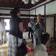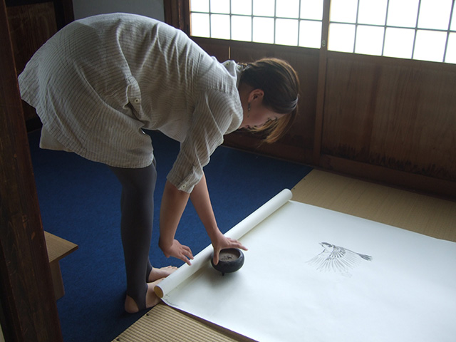 襖絵プロジェクトの制作者は若い、可愛い、村林由貴さんという御嬢さんで ニコニコと応対して下さり とてもこのダイナミックな墨絵の作者とは思えないような 穏やかな優しい方でした。松の大木の力強さ、鯉の躍動感、植物、花の可憐さと美しさ、それぞれに彼女の特徴が出ており それは素晴らしいものでした。そして これから画く予定の 部屋の端から端までの紙に画かれた雀の下絵は 一羽一羽の表網が異なり 可愛らしく 動きがあり 自然そのものという感じでした。 又 雀の後は カエルで これがカラフルで楽しく、色々なしぐさをしていて とてもユーモアがあり 楽しい作品でした。 そんなお茶目な所も持っている女性なのだな という事が分りました。 Cheryl も大変感動しており 地元の新聞とテレビの取材がありましたが それに答えて このような若い女性が 500年~600年先にまで残る作品を残し 日本の文化を後世に繋げることは素晴らしいことだと言っていました。 村林さんの作品は未公開なので ここに写真をお見せできないのが残念です。 8月には公開される予定ですから 是非 皆様見にいらして下さい。