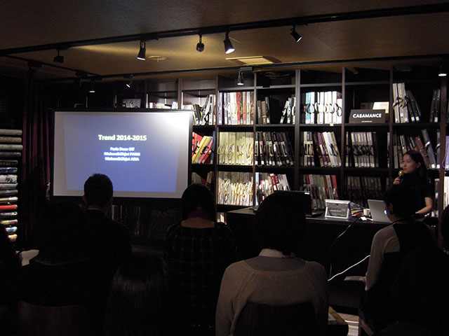 雑誌「コンフォルト」などでトレンド分析をされテキスタイル事情にお詳しいだけあって、出店各社の商材をテーマ毎、デザイン別にわかりやすく詳しくレポートしていただいた上に、シンガポール・デザイン・ウィークなど盛り沢山にお話いただきました。
