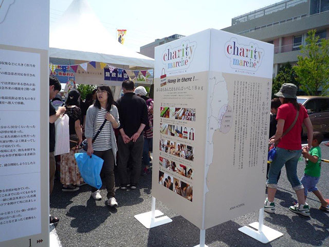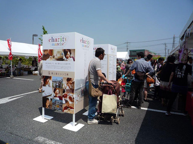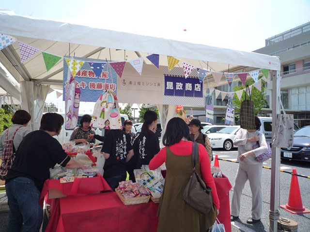 その病院は長年チャリティーバザーを開いていますが、今年はミシン工房の製品をバザーに出したいと企画してくださいました。そして、モノを売るだけでなくその存在を知ってもらうのも支援の一つということで、畳一畳分の大きなポスターを作成してくださいました。5月24日の五月晴れの土曜日に駐車場で食べ物の屋台などと並んでバザーが開かれ、たくさんの人たちが「南三陸ミシン工房」のことを目にしてくれました。