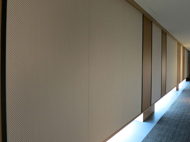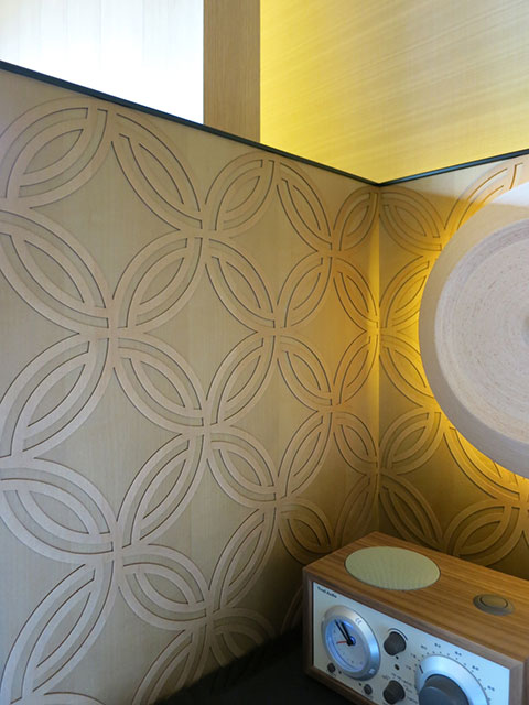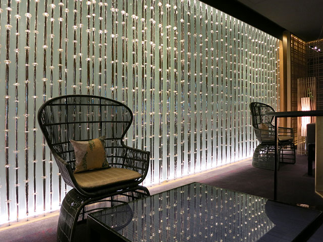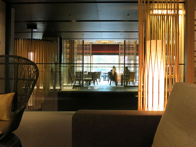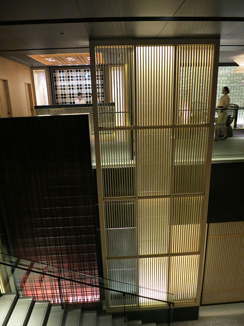 もうひとつの扉が開くとそこには美しい格子が連なるラウンジや吹抜けの階段室が目に飛び込んできます。縦、横、麻の葉など様々な形の格子や組子細工がパネルや照明、家具デザインに組み込まれ、日本の伝統美をストレートに表現。これらが生み出す光と陰が幾層にも重なり合って見る者の心に響きます。