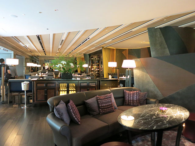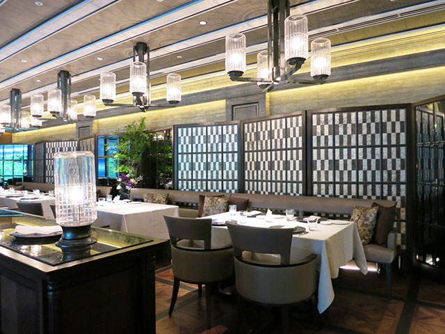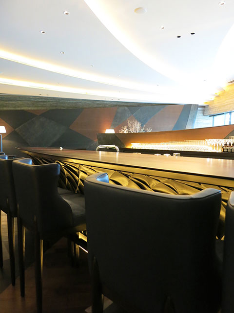 まずこのレストランで注目すべきは天井のデザインでしょう。大きな弧が重なりリズムを生むバーコーナーの天井をはじめ、縦ラインを強調したダイニングの天井などダイナミックにシーン毎に変化を加えています。床にはモザイクタイルをアクセントにダークカラーでまとめ、大人が楽しめる上質な空間に。