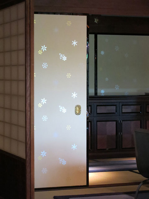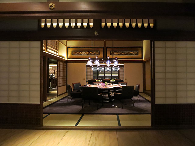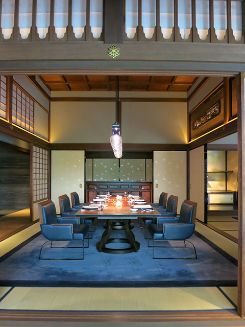 美しい金彩の雲が浮かぶ襖や格式ある書院。伝統的な和室の中にガラスのペンダントやダイニングセットを配し、美しい個室として凛とした姿を見せています。ライティングも工夫され、この旧夷川邸が洋の東西を問わず空間の中に異質なものとして浮き上がることなく、光の濃淡の中美しいアクセントとして存在しています。
