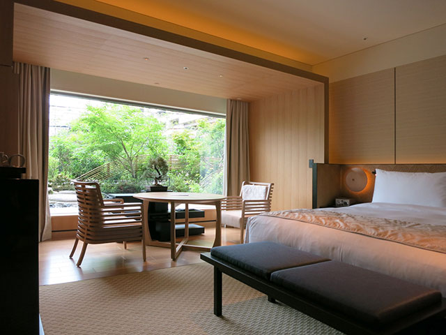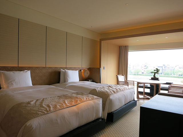 鴨川に面した側に客室を設け、外からも内からも京都の町に溶け込むよう配慮されたデザイン、設計になっています。窓辺に小さな盆栽を配し、水の流れと空を眺める客室は滞在客の心を洗ってくれることでしょう。