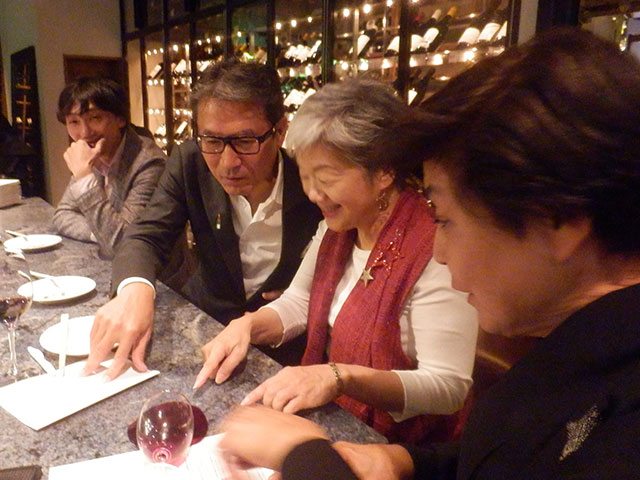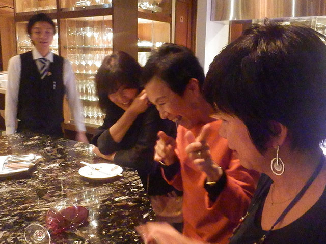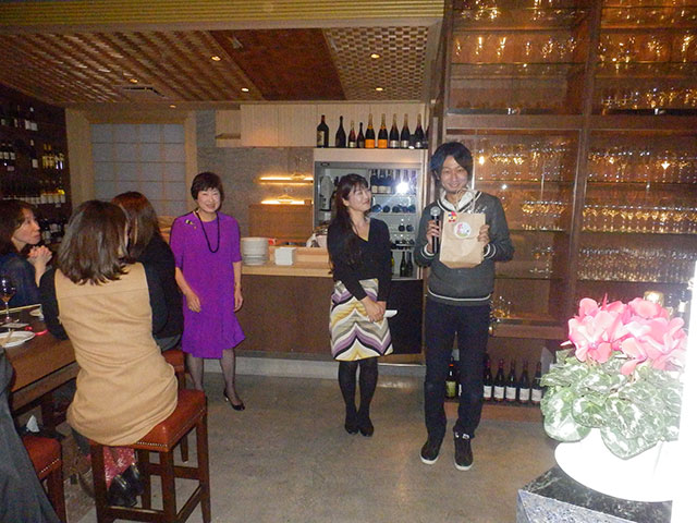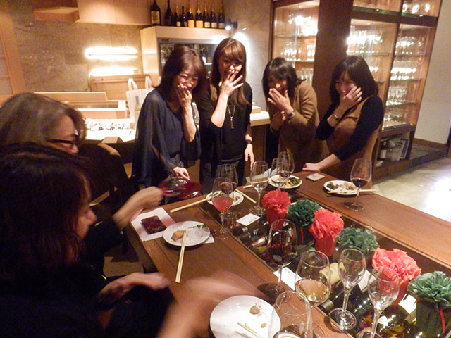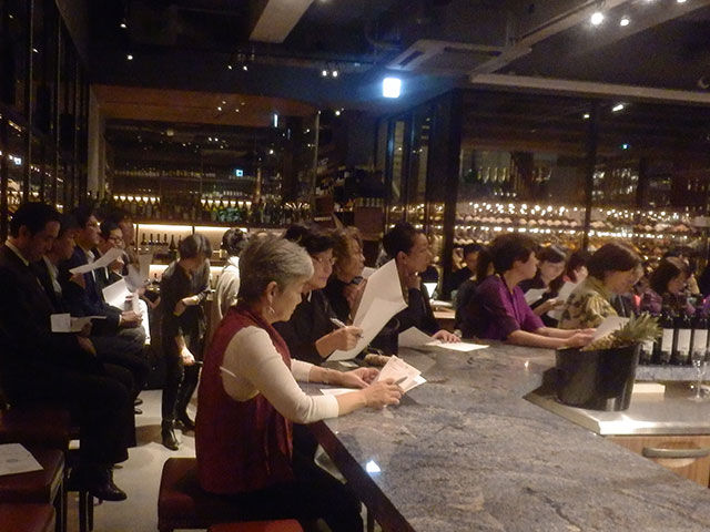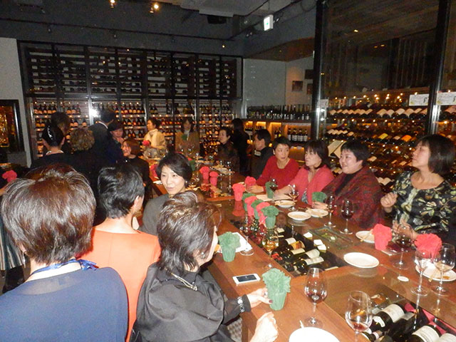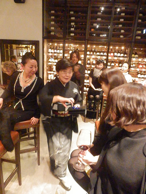 地下に続く階段を降りると壁面いっぱいワインに囲まれワイン通にはたまらないほどワインが揃えられています。会員、非会員合わせて45名程の方々が参加されました。今回のパーティーのドレスコードはワインハウスにちなんで、ワインに関するものを身に着けてのご来場となりました。ワインカラーのドレス、ブドウ&ボトルの形の手作りアクセサリー、鯛の形のワインオープナーを付けたクラッチバックなど趣向を凝らしたアクセサリーと皆様の個性的なドレスアップで会場は盛り上がりました。一人ひとりお見せできないのが残念でした。
