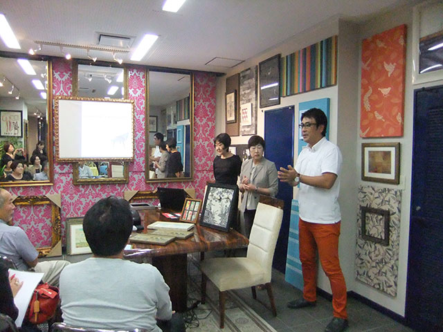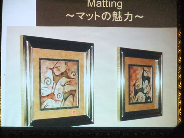 額を飾り付ける際のレイアウト、バランスや、絵を保護し惹き立てるマット使いの手法など 作品や空間の魅力を惹きだす効果や技術を映像交えて教えて下さいました。