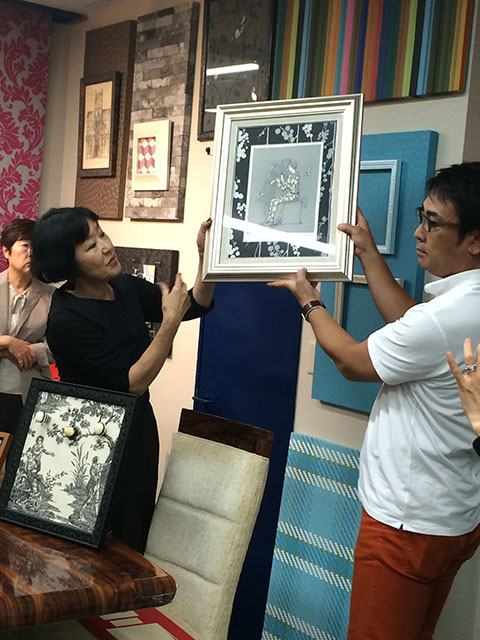 また、ショールームの額装と、いろんな色のマットを実験的にコーディネートしながら、 絵と額装は呼応し合うと魅力が増す事を見せて下さいました。