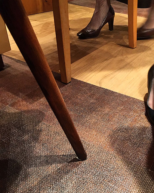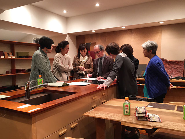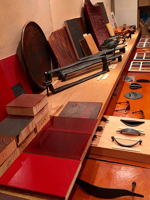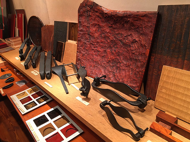 小さなショールーム内でも驚くほど数多くの製品や素材を拝見できました。「デザイナーの引き出し」とも言われているこちらの会社は、漆に始まり、木・鉄・布・紙などの自然素材を使用した製品が多種あり、オリジナルの鋳造のハンドルやノブもあります。黒々とした重量感のあるインテリアアクセサリーで、剛健さが魅力的なデザインでした。床材もショールームの床で使われておりましたが、麻布の漆塗りの床磨いうその商品は、滑らず歩行感も良く、水や薬品にも強く耐久性もある。遠目で見ると毛足の少ないカーペットのようなスムースさ、立った近くを見ればその素材感が感じられとても素敵でした。また和紙を使った壁紙では、漆を塗ったもの、柿渋を塗ったもの、膠と顔料で淡く彩色した伝統色が美しいものがあります。特に漆和紙の壁紙は、水周りにも使用でき、中には不燃材の認定も受けている熱にも強い素材。陰影強めのその見た目の独特さは空間の表情作りの可能性を広げる製品です。