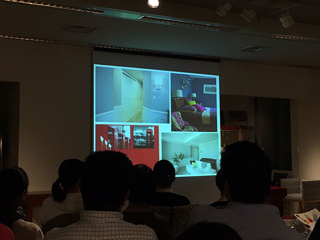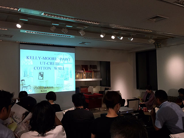 ブライトン株式会社はアメリカの大手塗料メーカー「ケリーモアペイント」の商品を始め、壁の仕上げ用建材を中心に取り扱う企業です。水性塗料のケリーモアペイントは顔料の種類が国産のものより多く、表現できるカラーは15000色以上。美しく微妙なニュアンスを表現できるカラーを施工事例を踏まえてお見せ頂きました。個人邸からトレンドやデザイン性が求められる店舗にも使用されており、仕上げの選択肢が広がる山本さんの説明を皆様興味深く聴いていらしゃいました。厳しい基準がある環境基準、健康基準にもクリアしている商品ということで、高い安全性がある点もお勧め頂きました。塗料メーカーが数多くあるアメリカにおいて大手5社に入るその実績は素晴らしく、日本での今後の発展に山本さんも熱意を語って下さいました。