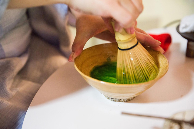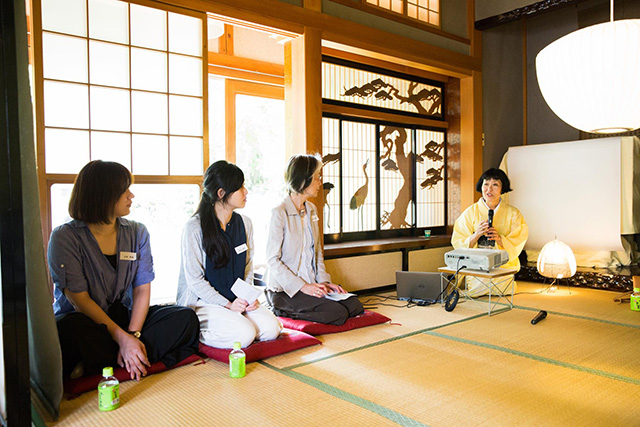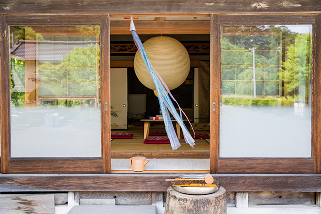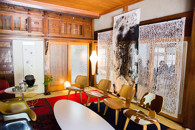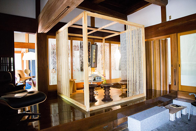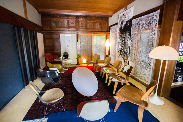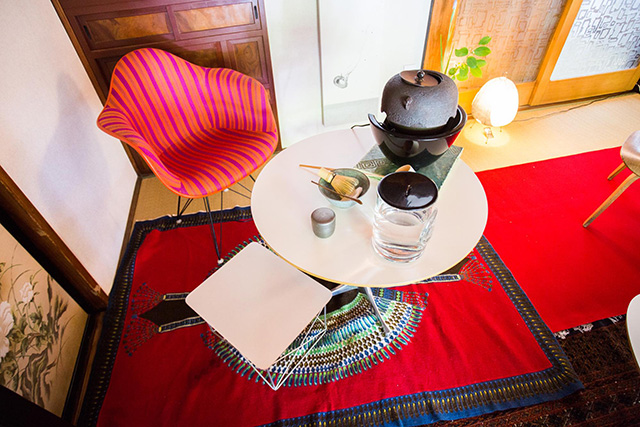 古民家には、田中氏が所有するヴィンテージのイームズ家具を使って、しつらえ全般は丹羽さんにつくっていただきました。当日のお茶会のために、日本伝統の和紙や生地、マハラム社のファブリックで作られたクッション、モバイル和空間Cha no maなどお茶会に賛同してくださる協力者のかたがたのご好意によってご提供いただき、インスピレーション溢れる空間ができました。