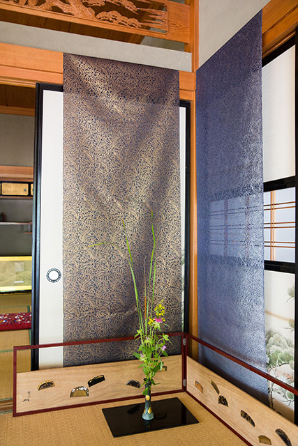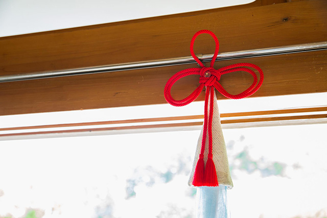 主席のご亭主は丹羽さん。1951年にイームズ夫妻の依頼で亭主をされた松本宗静先生のお弟子さんにあたることが発覚。こんなご縁もあったのですね、という話になりました。古民家に入ったところから参加者によるこのお茶席の謎解きがはじまります。テーマは一日限りのお茶室となった「久我の庄」改め「由良平庵」が示すように、「ゆらゆら、ひらひらするもの」でした。ゆらゆら、ひらひらするものが室内のしつらえのいたるところにあり、参加者の方々も大変興奮して謎解きに取り組まれ、室内の装飾をじっくり見ていただきました。謎解きの正解者にはマハラム社のこれもまたゆらゆらのパターンのクッションをプレゼントしました。