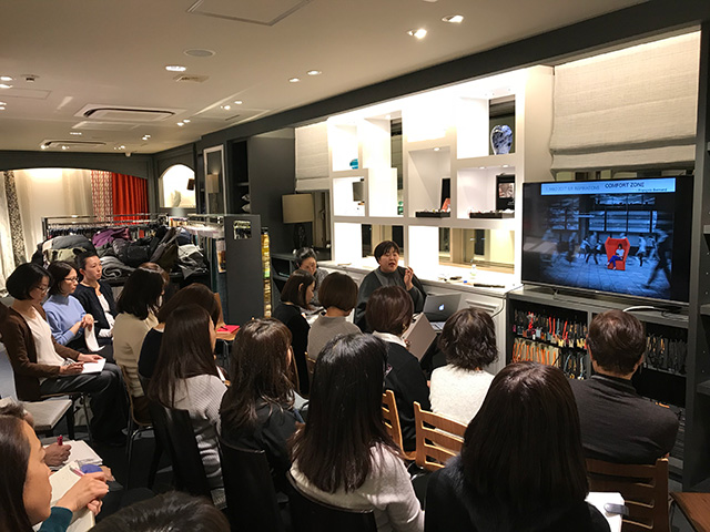 講師は昨年に続き、企業向けにトレンド分析のセミナーもされているIIDAプロフェッショナルメンバーの細井絵理子さんです。過去との比較、現在のトレンドと、これからきそうなトレンドインフルエンスを画像と共に解説下さいました。