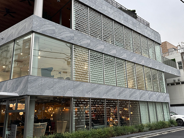 シャープでモダンな印象の建物の全体像とは別に、ビルのオーナーである分林家と深い関わりがある観世水の文様がエントランスの壁面やガラス窓に用いられているのが印象的です。美しいディテールや上質なマテリアルなどが細部に見られます。