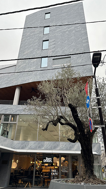 南青山に2023年の5月にオープンした文化発信拠点を目指す複合施設「IDÉALビル」は、地下1階~地上3階の商業エリアと上層階の住居スペースで構成されています。樹齢約300年の大きなオリーブの木が見下ろす広場があるこのビルの設計は、中村拓志氏(NAP建築設計事務所)。