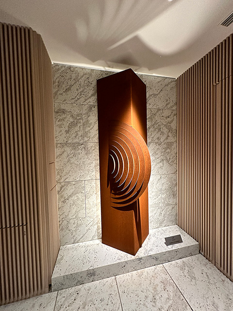 エレベーター前の空間に飾られたオブジェはファッションデザイナーのコシノジュンコ氏が分林さんのために制作したオリジナル。タイトルは「山水」。床の間にかけられた掛け軸、山水は山から流れる水の波紋、徐々に変化する鉄の錆が表現されています。