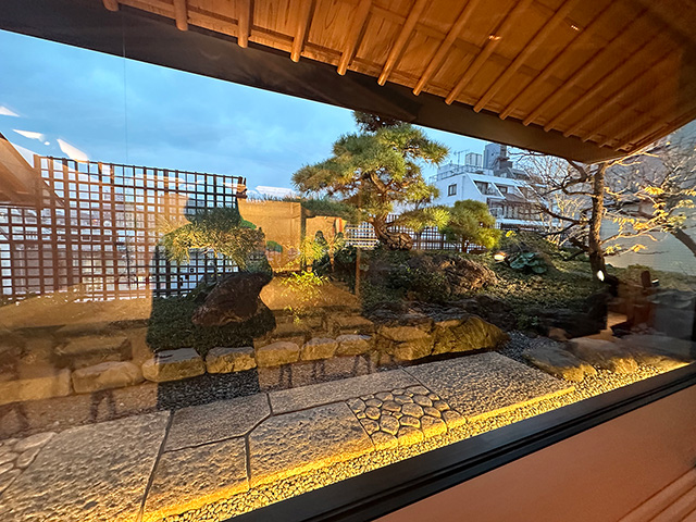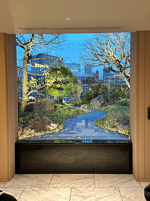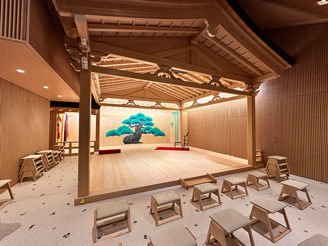 能舞台があるフロアのエレベーターのドアが開くと、目の前に尾形光琳「紅白梅図屏風」をモチーフとした石庭が現れます。石製の川の両岸に紅白の梅が植えられ、一気にその世界観に引き込まれます。左手のドアを開けるとそこには屋根を頂く総檜造りの能舞台。個人邸の、ましてや商業ビルの中に入っているとは思えない圧巻の造りです。能舞台の周りのエリアの壁は繊細なリブ仕立ての壁。見所(観客席)には造り付けのベンチのほか、スタッキング可能な高さ違いの椅子も用意されています。また、白州にあたるその床には京都の修学院離宮の隣雲亭に見られる「一二三石」をモチーフにしたオリジナルカーペットが敷き詰められています。ベンチの後ろ、松の鏡板と相対するように配されたガラス窓の向こうには、寿の字に似た老黒松と磐座の庭があります。