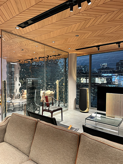 一面がガラス張りの完全防音のシアタールームが設置されていますが、音響と映像が身体を包み込むイメージで、もし自宅のリビングルームの一角に設置できたら毎日、非日常な空間でリセットでき、新しい自分になれそうな…是非お客様に提案していきたい空間です。