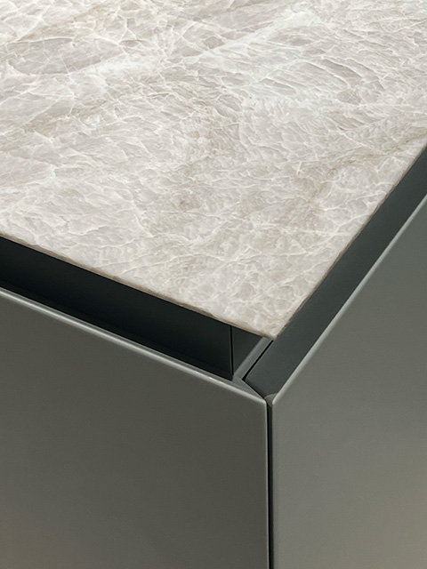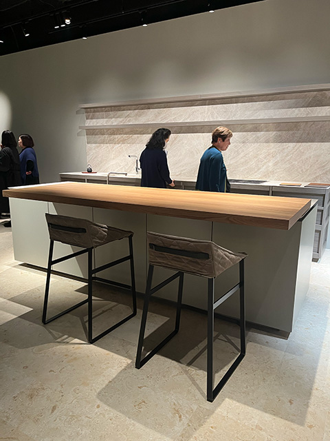 minotticucine(ミノッティクチーネ)は、イタリアベローナ地区に本社を持つ1949年創業のシステムキッチンメーカーで、天然石や天然木の美しさを生かしたミニマルで高性能なキッチンが特徴です。ショールームには、キッチンの長さを強調し、視点を長くするための溝の水平線が特徴な「GANDHARA」、日本の障子をモチーフとして取り入れた「HANAMI」、地球の計り知れない価値を厳密な幾何学模様と石や木などの天然素材で表現した「TERRA」の3つのキッチンが展示されており、美しい造形と計算された機能性を実際に触れながら体感することができました。