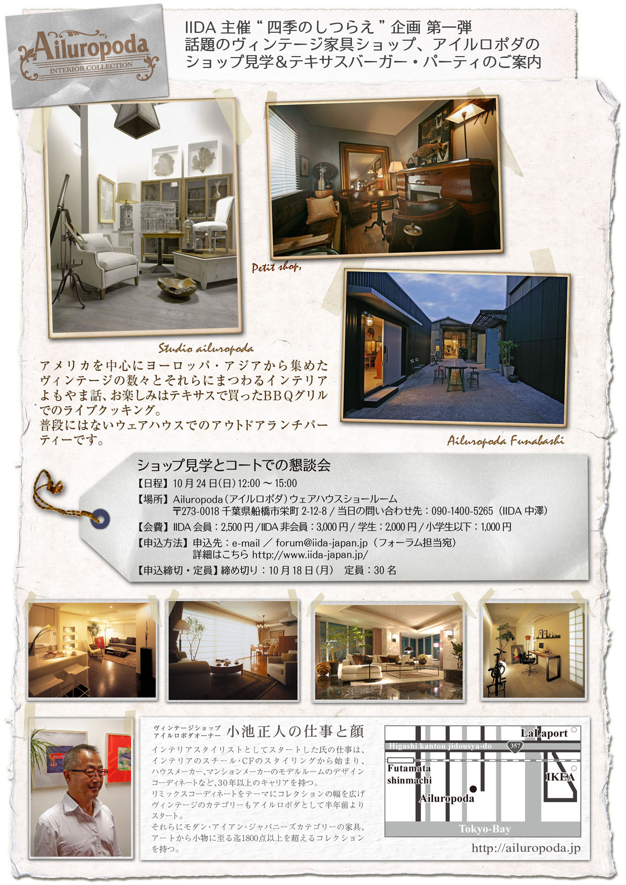 | 場所 | Ailuropoda(アイルロポダ) ウェアハウスショールーム http://ailuropoda.jp/ 〒273-0018 千葉県船橋市栄町2-12-8 当日の問い合わせ先:090-1400-5265(IIDA 中澤) |