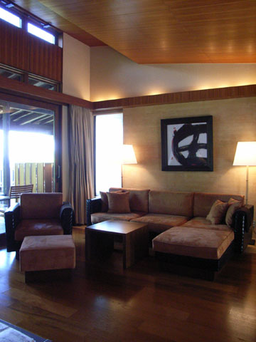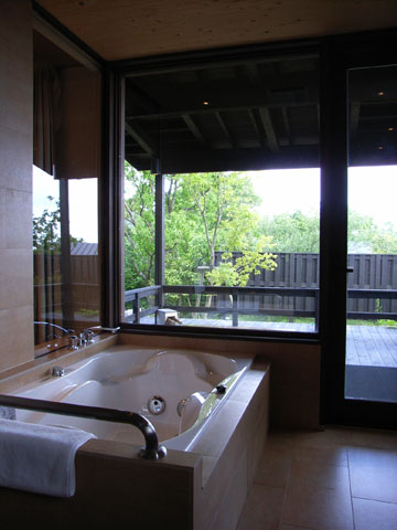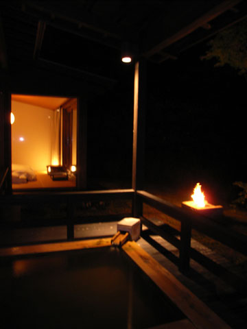 78平米の客室はゆったりとしていて落ち着く空間でした。華美な装飾は一切なく、奇をてらったようなデザインも一つもありません。モダンになりすぎた「尖った和」でもなく、異国情緒も混在していません。現代の日本人が「何となく落ち着くね」そうつぶやくであろうさりげない配慮が家具のサイズ、空間の広さ、素朴な自然素材に表れています。ですから最初の印象よりも過ごす時間が長くなる程に、その良さがわかる、そんな空間でした。別荘としてあったらいいなと思わせる程よい「ゆとり感」と和室や土壁、書の額など控えめな「和」のデザインが今の私たちにフィットしているように感じました。そしてなんと言っても温泉です。外のデッキに配された檜の露天風呂は昼も夜も最高でした。