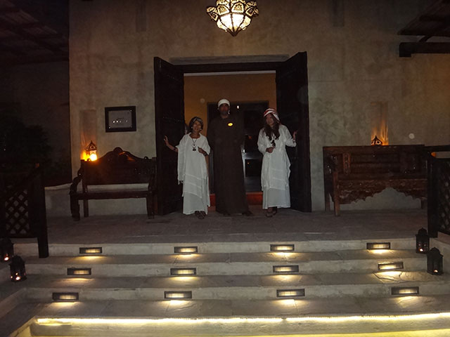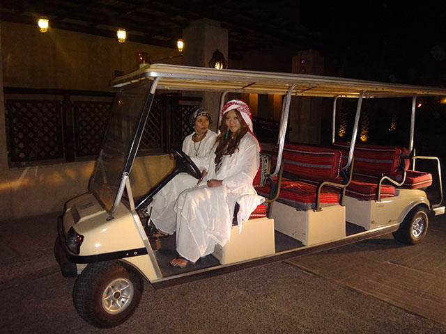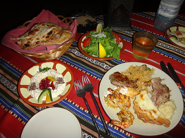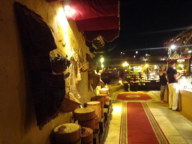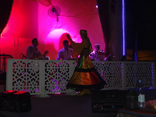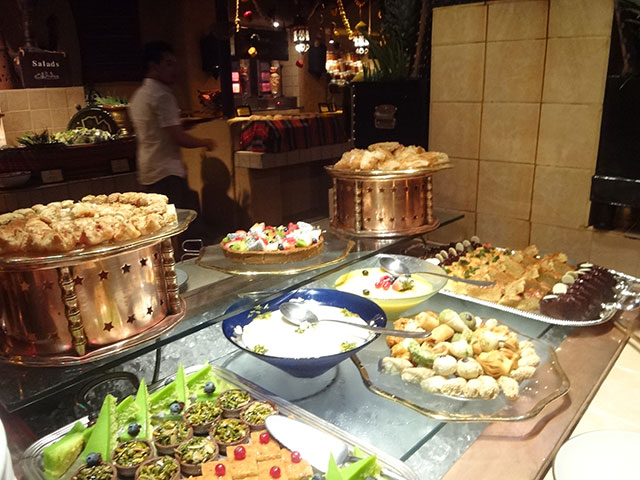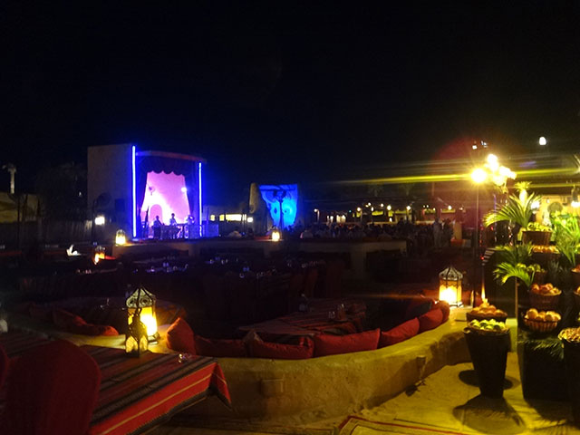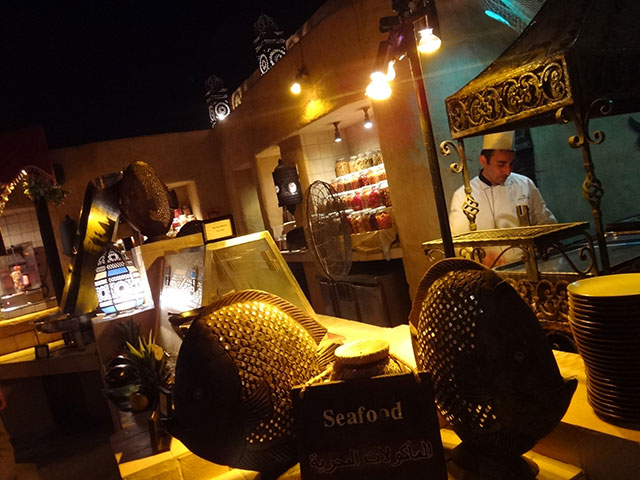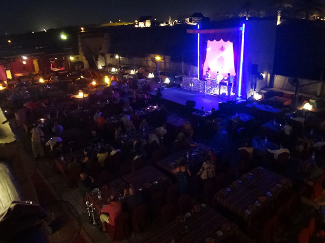 バブ・アルシャムズのレストランですが離れた所にあり、カートで連れて行ってくれます。宿泊客でなくても予約できます。7時から10時半ごろまでアラビック音楽の演奏、ダンス、ベリーダンス、ホースとキャメルの砂漠の劇場のショーと飽きることがありません。大規模な種類の豊富なバイキングです。