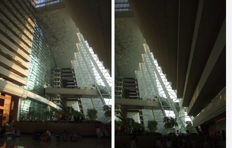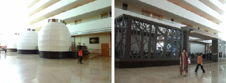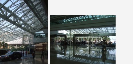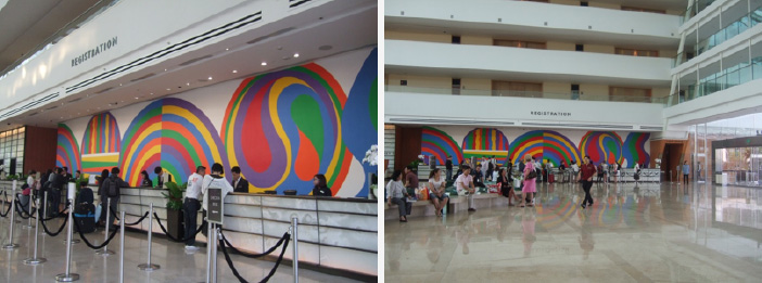 カラフルなフロントでチェックイン。 大勢の人が右往左往しているが 余りに広いので 混んでいるようには見えない・・・・