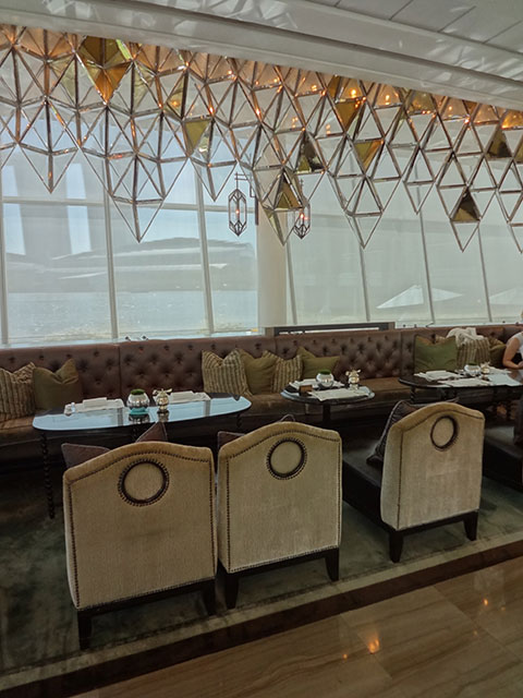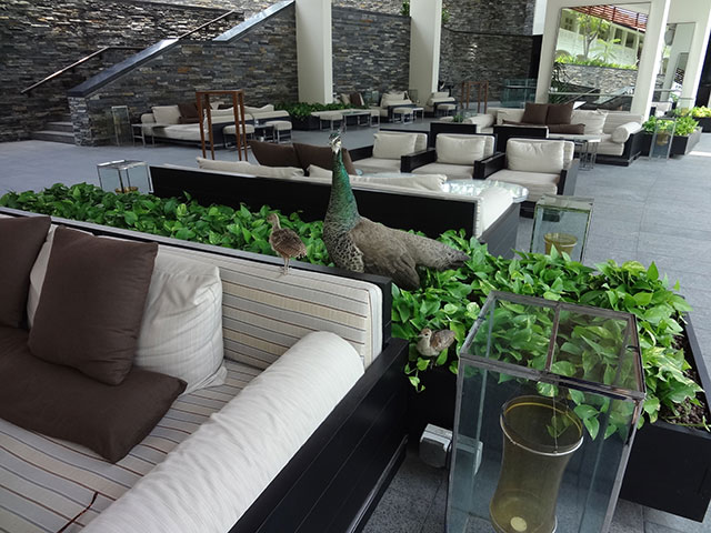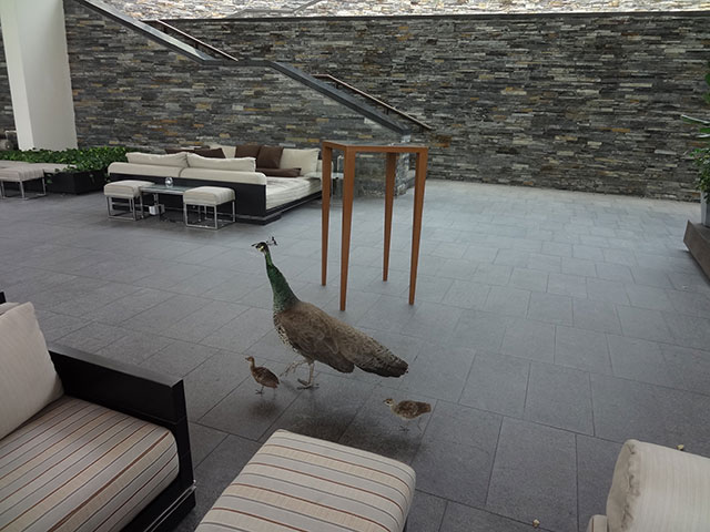 建築様式のコントラストに驚き、階下のサロンでは“クジャクの親子”のもてなし!?・・・にさらに驚く。