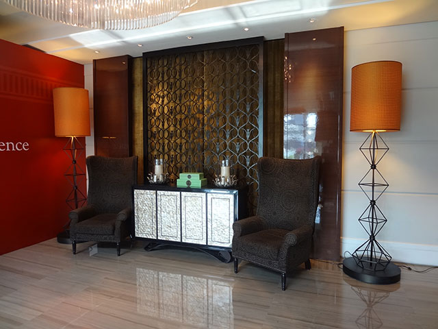 ホテルレセプションへの長い通路は「コリドール」と呼ばれ、埠頭やマリーナベイを望むランディングポイント。