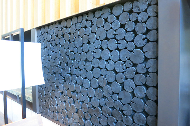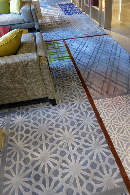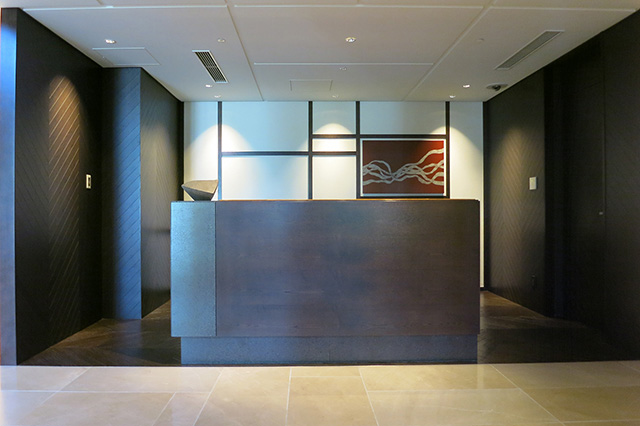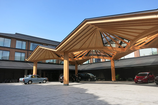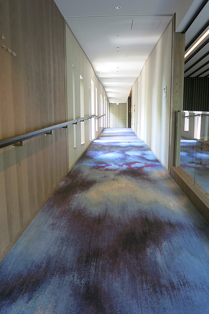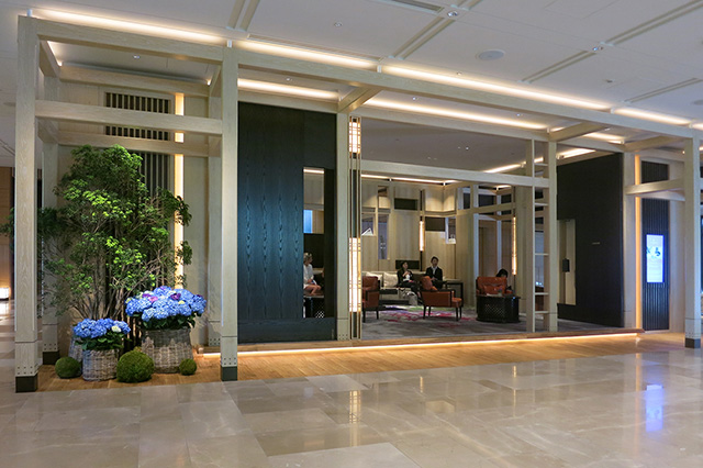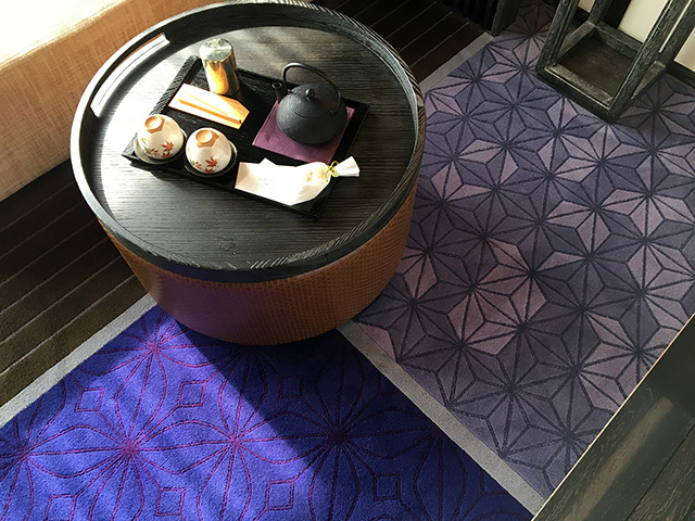 このホテルのもう一つの特徴は、春や秋のハイシーズンでも泊まれるよう分譲タイプの客室があること。その客数は全体の約3割を占め、富裕層ニーズに応えています。その分譲タイプの宿泊客などが使用するサブエントランスが客室エリアの中間にあり、ソファ席の床には麻の葉などの日本の伝統文様を複数パッチワークしたようにデザインされたオリジナルカーペットが敷かれ、エルメス製の人力車が飾られるなどのオリジナリティある和のデザインの演出が見られます。