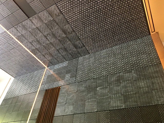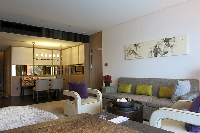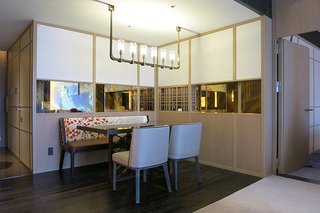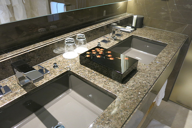 昨年秋にオープンしたフォーシーズンズホテル京都に宿泊。三十三間堂から徒歩数分の好立地でありながら、ホテル周辺は静かで落ち着いた雰囲気。静かで控えめな竹のアプローチに始まり、茶室も要した歴史ある日本庭園「積翠園(しゃくすいえん)」を望むメインダイニングなど、敷地の高低差を生かしたダイナミックな吹き抜けを持つ空間構成。見所の多いホテルです。スパやエステルームも充実した作りでリラックス出来、客室は和の文様と美しい差し色が魅力的。ホテル側のご好意で1室空きがあったスイートルームも見学させていただきました。木目の美しい壁面と組子を取り入れた造作棚。高さのあるレザーのベッドヘッドボードと水彩画タッチの和紙風壁紙の組み合わせ。和紙のシェードの照明など、和を感じる素材を適度にポイント使いし、バランスよく構成しています。標準的な客室でも食事が取れる大きさのテーブルやソファを配し、49平米以上の広さを確保。ゆったりと過ごせる空間に。床には板張り、タイル、カーペットがシーンごとに貼り分けられ、色鮮やかな和の文様や絵画のようなグラデージョンが美しいオリジナルカーペットが使用され印象的。クッションや椅子と同色にしてカラーコーディネートする工夫も見られます。バスルームの動線もよく考えられており、シャワーメインの外国人客も、浴槽と洗い場を分けたい日本人客もガラス戸の開閉で2つの使い方が選べるよう工夫されています。