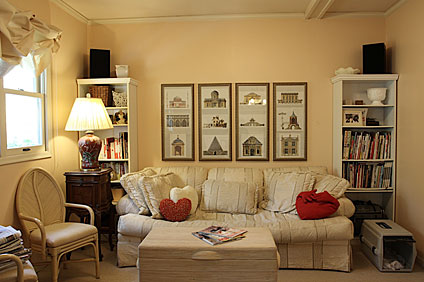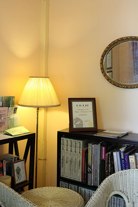 椅子に書棚、額や鏡、フロアスタンドが並び小さなサロンのよう
