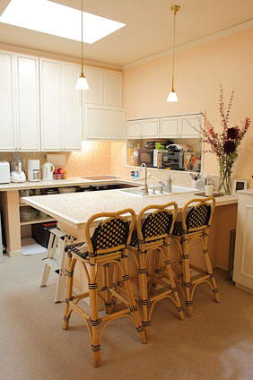 まずは玄関。いわゆる“たたき”はありません。靴を履いたままの生活スタイルなので扉を開けると椅子や書棚が配されたホールになっていて来訪者を迎えてくれます。そして上階に伸びる白い手すりが印象的な階段。TOPライトから差し込む光が柔らかく階段越しにホールを照らします。どの部屋も開口部は決して大きくはありません。以前からあった窓を塞いだり小さくすることでデザイン性やプライバシー、収納を確保している分、改装後の壁面の開口面積は減っています。しかし、TOPライトを3カ所設けて採光を確保。太陽の動きや天候と共に部屋に差し込む光の表情がダイレクトに変わる天然の照明は、アンティークの家具が配されたリビングやキッチン、バスルームをやさしく照らします。開口部を大きく取り、外との境を極力排除した開放的な住まいがある一方、U邸は、外と内の世界をある意味しっかりと隔てることで、住まいの個性をより際立たせる方法があることを改めて教えてくれます。出窓があった場所に額装した扉をつけて収納にするなど、リフォームだからこその工夫も随所に。