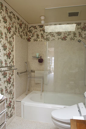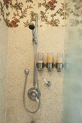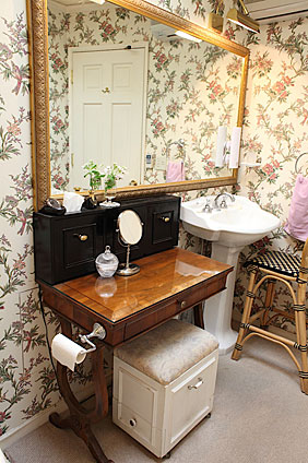 花柄の壁紙とモザイクタイルでエレガントにまとめられている