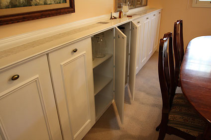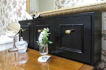オリジナルの手作りキャビネット(とても手作りには見えません) 額縁を加工して作ったガラスの扉も手作り
