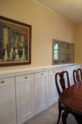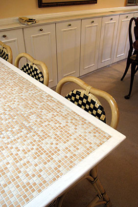 そしてこの家には進化し続けている部分も。それはご夫婦のDIYによる手作りキャビネットやテーブル、スツールなど。ダイニングテーブルの脇にある4m以上にもなるロングキャビネットはなんと今年作ったお手製!コストカットのため本体部分は白のカラーボックスに台輪を取付け使用。天板には現場で残ったモザイクタイルを貼り扉と共に白く塗装。なんとあの素敵なリビングにブルーシートを敷いて塗装したそうです。最後の仕上げは扉のつまみ。今年の夏に旅したロスで素敵な鋳物製を仕入れて完成です。その上部にある壁面収納は出窓を再利用したもの。扉は額縁にガラスを嵌め、こちらも手作り。この他にTV用テーブルや洗面所の小物入れなど、あちこちにオリジナルの家具や小物がさりげなく置かれています。どれも工夫に富んでいながら家のスタイルに合ったデザインのため全く違和感がありません。お二人の住まいへの愛情と楽しんで手を加えていらっしゃる様子が感じられます。