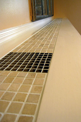 広いカウンターにはモザイクタイル カウンター下の収納はオープンスタイル、壁面収納は出窓を改良したもの