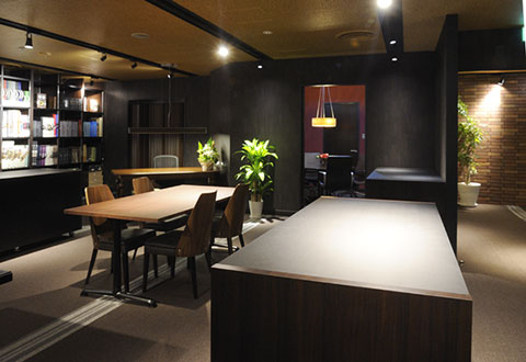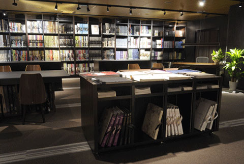 以前より倍近く広くなったスペースは全体でおおよそ80平米。そこには500冊を超えるサンプルブックがまるで大きなライブラリーのように美しく壁面に並んでいます。その手前には大きな台やテーブル席が複数あり、何冊ものブックを広げてじっくり吟味出来る場所になっています。また、クライアントと一緒に訪れた時など、他のお客様を気にせず打ち合わせが出来る個室スペースもあり、来場者への心配りが感じられます。休館日の水曜日には、この広いスペースをセミナーや勉強会に使ってもらえるよう事前予約・相談で貸し出せるようにもなっているそうです。